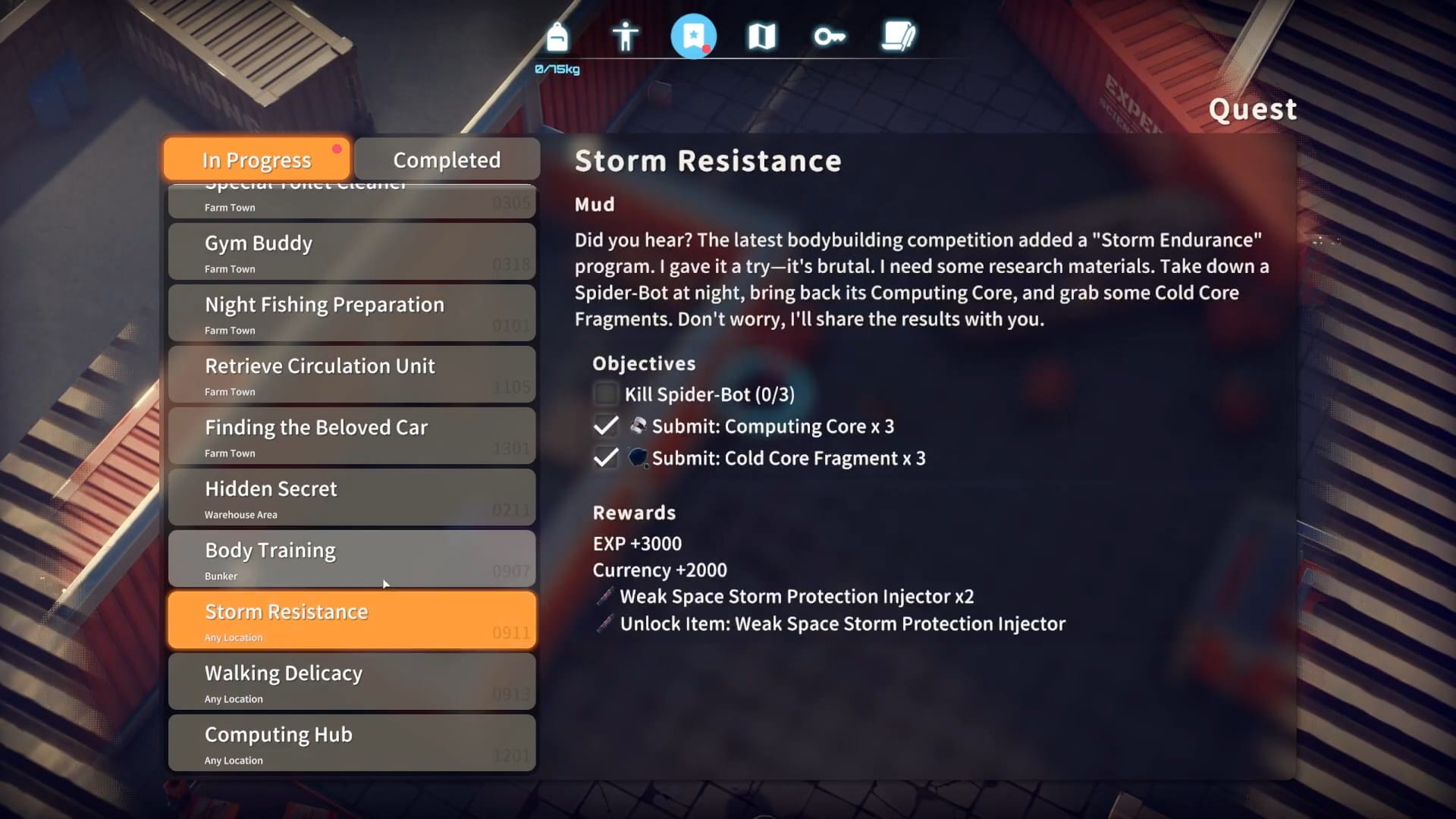 The quest Storm Resistance is given by Mud and can be completed in any location. You’ll hunt Spider-Bots for computing cores and cold fragments. Completing it rewards XP, currency, and a new injector unlock.