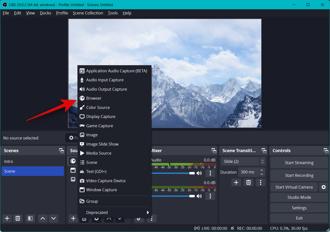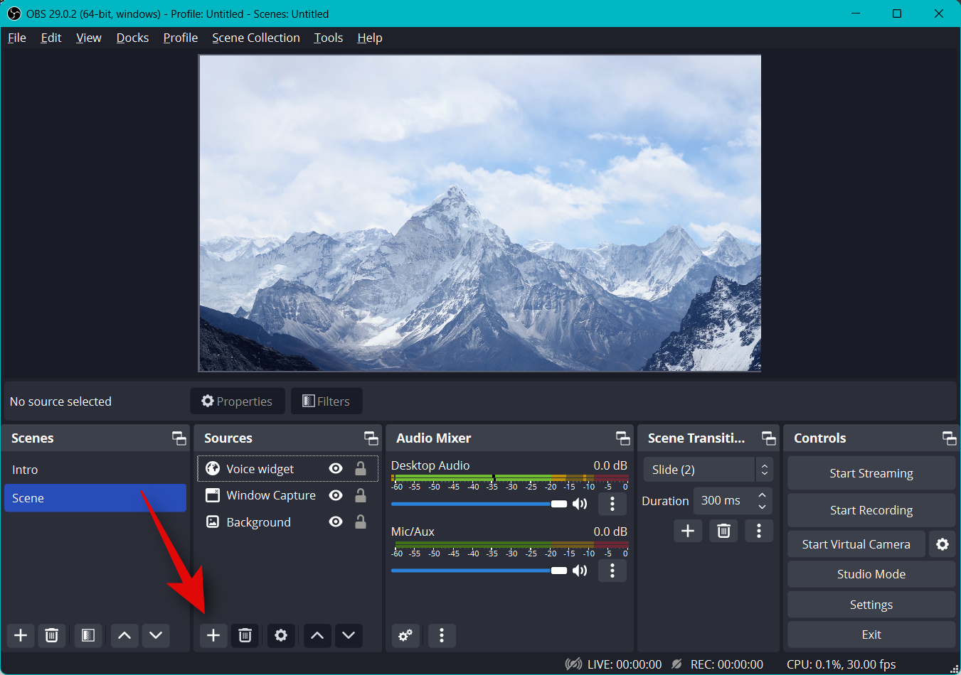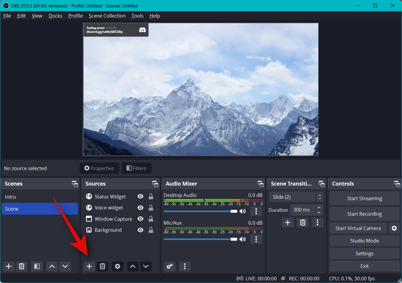 Now switch to OBS and click the + icon under Sources.