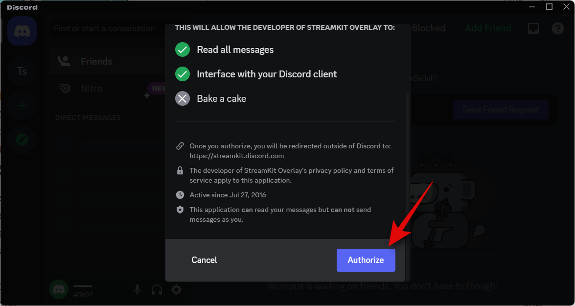 You will be automatically redirected to the Discord app with the Streamkit asking for your permission to authorize it. Click Authorize.