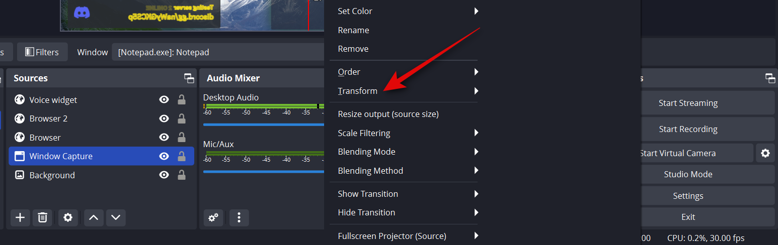 Now as discussed above, we will use OBS Virtual Camera to stream your entire setup to a channel in Discord. However, Discord auto-mirrors your camera feed whether you use a webcam or a virtual camera. Thus we will need to flip all our elements in OBS. This is a bit inconvenient but only involves a few steps. Click and select your capture source.