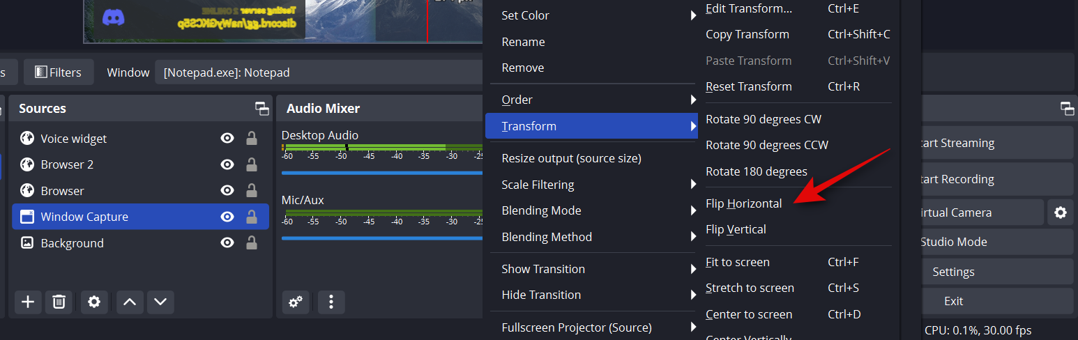 Your capture will now be flipped. In some cases, you might need to reposition the captured source on your base canvas. Repeat the steps above and flip all your elements on the base canvas horizontally.