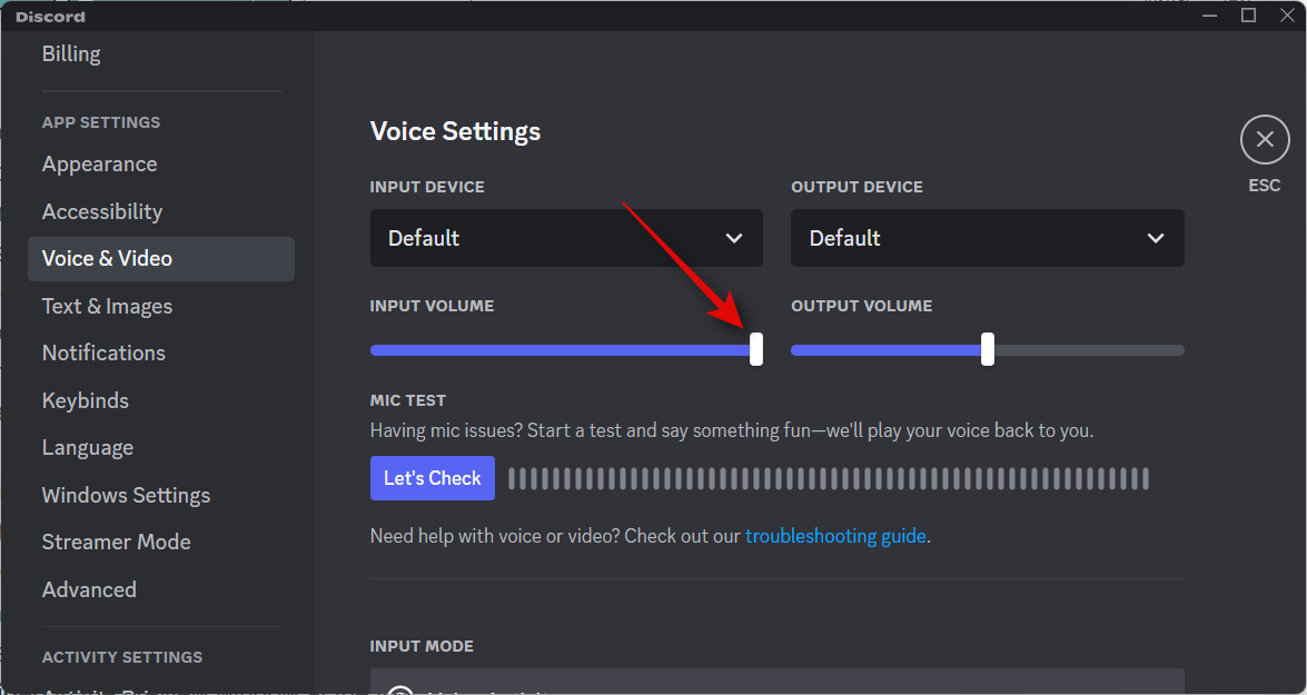 If you find your mic volume to be too high, you can either adjust it using the INPUT VOLUME slider in Discord or use the dedicated slider in the Audio Mixer section of OBS.