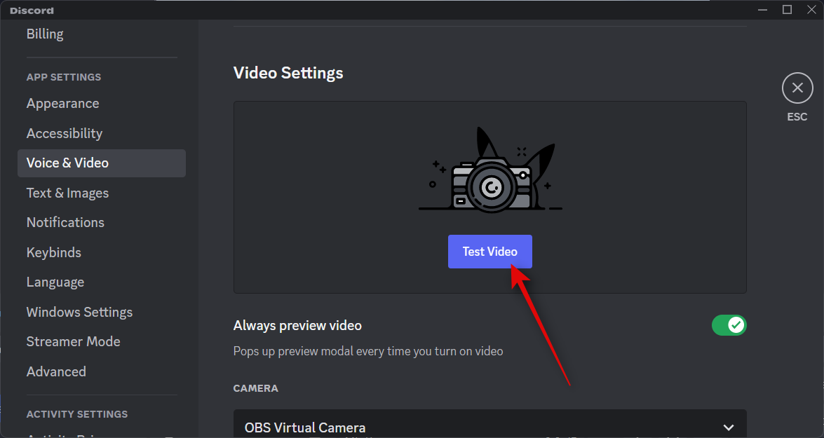 Once selected, click Test Video in the preview window at the top.