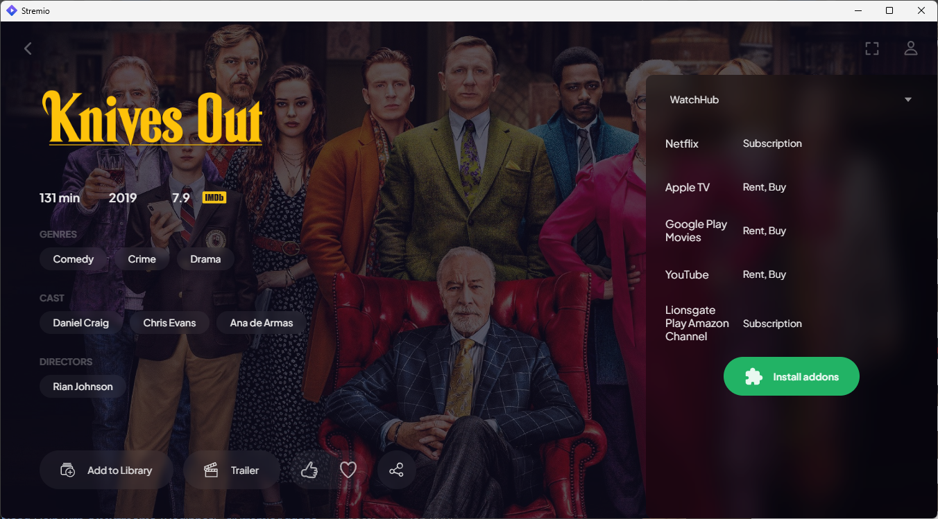 Being a pretty media aggregator, Stremio lets you find which streaming service a particular show or movie is on.