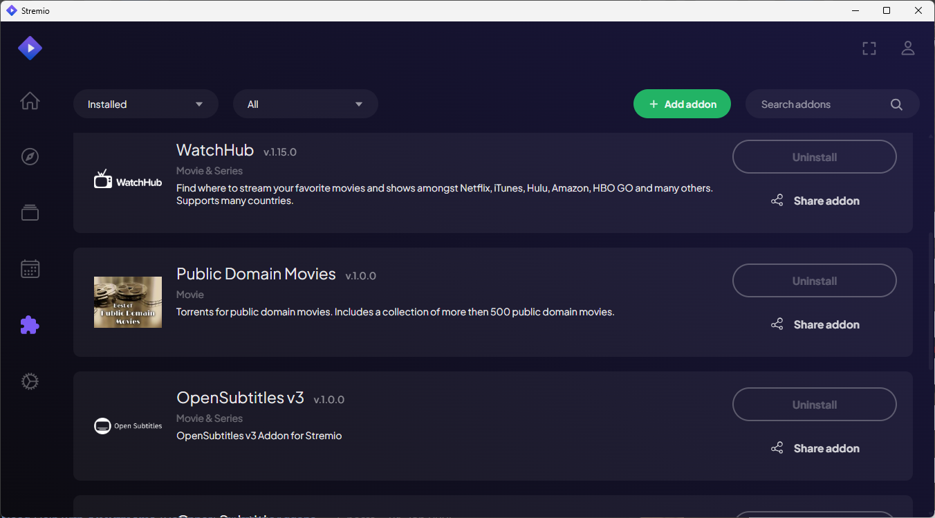 Stremio's wide variety of Addons is what makes it so versatile and easy to use. By default, Stremio with Addobs like WatchHub, OpenSubtitles, Public Domain Movies, YouTube, and others.