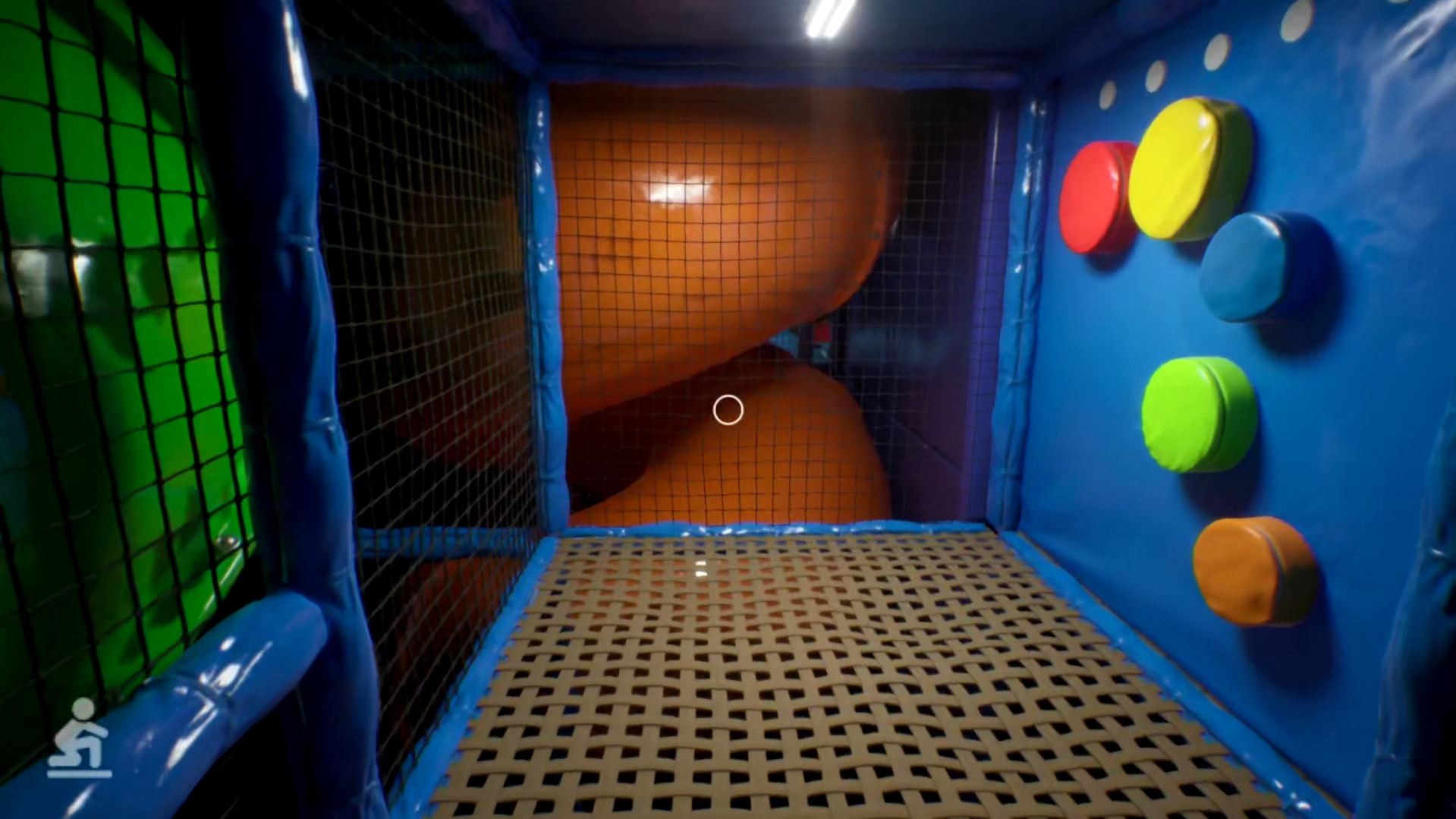 For this puzzle, head back upstairs until you reach the dead end, then turn around and walk toward the colorful buttons. As you do, pay attention to the colors of the slides in the order you see them — the sequence may vary for each player.