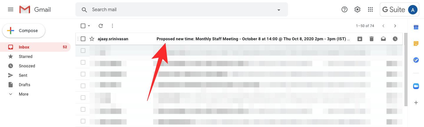 Alternatively, you can also suggest a new time through Gmail. If you have received an email invitation about an upcoming meeting, you can recommend a change in time by opening the email, clicking on ‘More options’ at the top of the meeting invite email, and then selecting the ‘Propose a new time’ option.