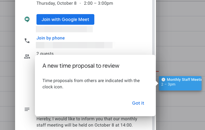 When you’re a guest to a meeting you’re invited through Google Calendar, you can propose a new time for the meeting to commence if the stipulated time isn’t feasible for you. Upon suggesting a new time, all organizers of the meeting will receive email notifications for proposals made by guests for an event.