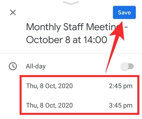You will now be taken to a new screen where you can either change the event time to the one that you were proposed which you can simply do by tapping on ‘Save’. However, you can modify the proposed time to something that better suits your schedule by changing the start and end times and then clicking on ‘Save’.