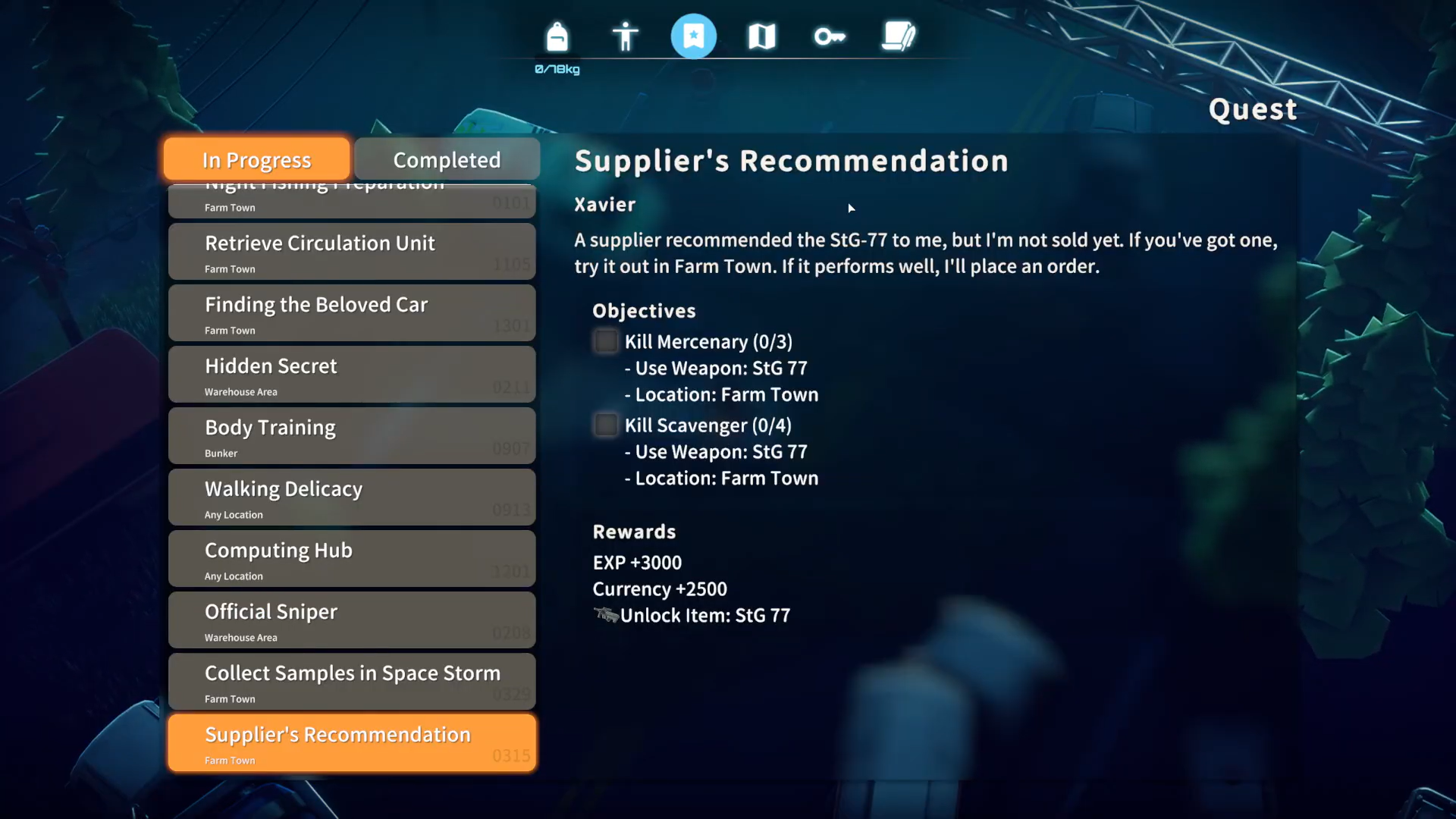 Xavier gives this quest in Farm Town. You’ll test the STG-77 weapon on local enemies. Completing it rewards XP, currency, and unlocks the STG-77.