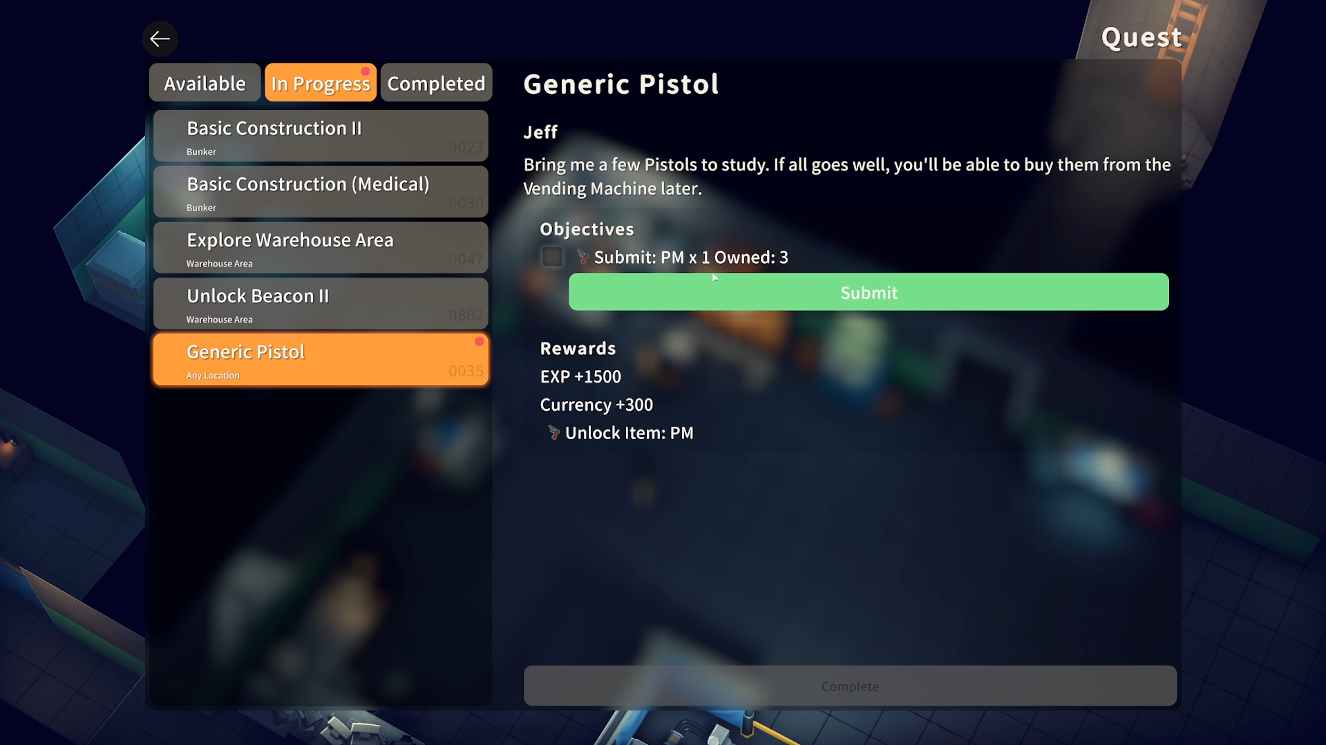 The Generic Pistol quest tasks you with submitting a PM pistol to Jeff in the bunker. Completing it unlocks the ability to craft this basic pistol and rewards XP and currency.