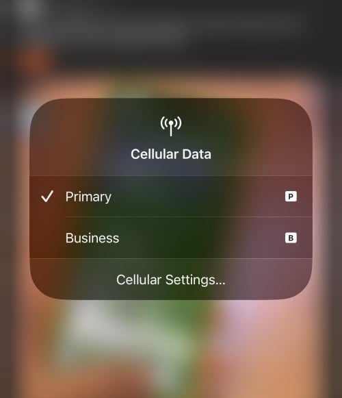 - From the ‘Control Center’, long press on the cellular data option to choose between two data lines.