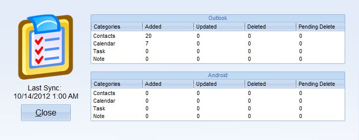- Click the Sync Button on the on the Android Sync Home window. This will start the actual synchronization of data, and you will be able to see the progress on your computer screen. Once done, a sync report will be displayed, where you can see how many contacts, appointments, tasks and notes were synced between Outlook and Android. See screenshot below