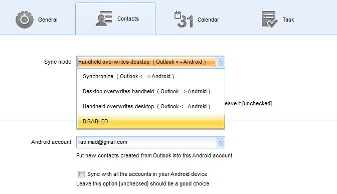 - Next, on the Contacts Tab, choose the sync mode. You should see 4 options. [Synchronize] -This is 2-way sync, and all changes between Outlook and your Android device will be synchronized both ways. [Desktop overwrites handheld] – Outlook data will be the master and data on your Android device replaced or overwritten, [Handheld overwrites desktop] – Android device data is master, and data in Outlook will be replaced or overwritten [Disabled]No sync. In case you do not want any data deleted, just disable the Sync Deletion option, by leaving it unchecked. See screenshot below