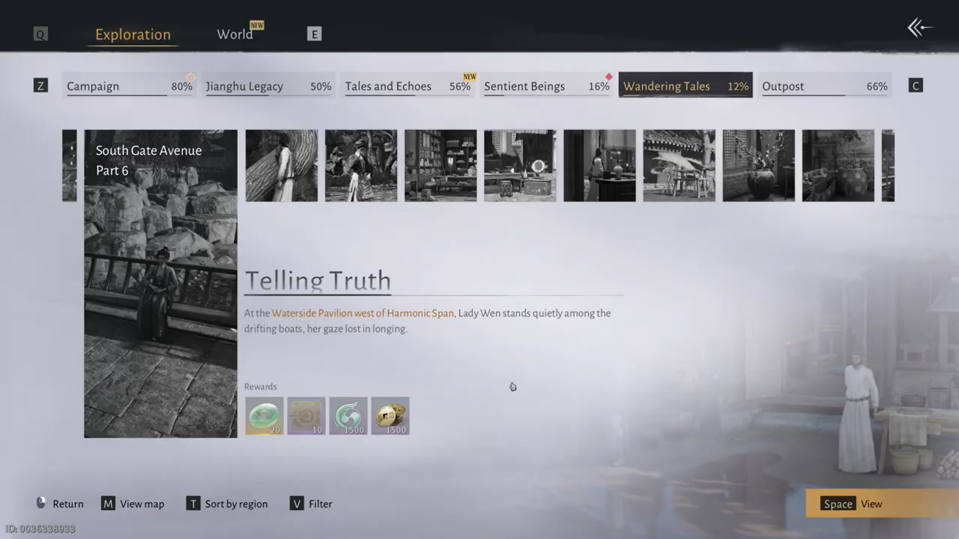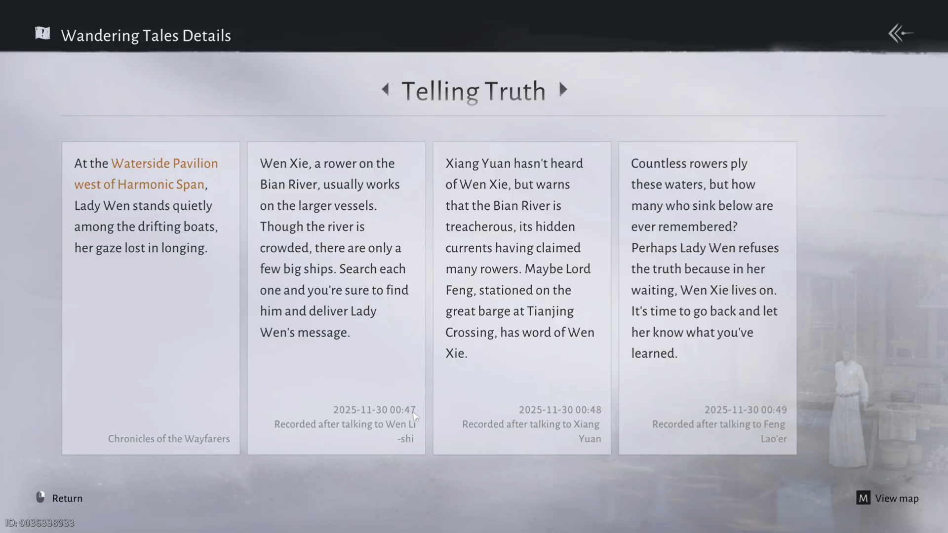 Go back to the Scenic Pavilion and gently tell Wen Li-shi what you’ve learned. This completes the Wandering Tale.