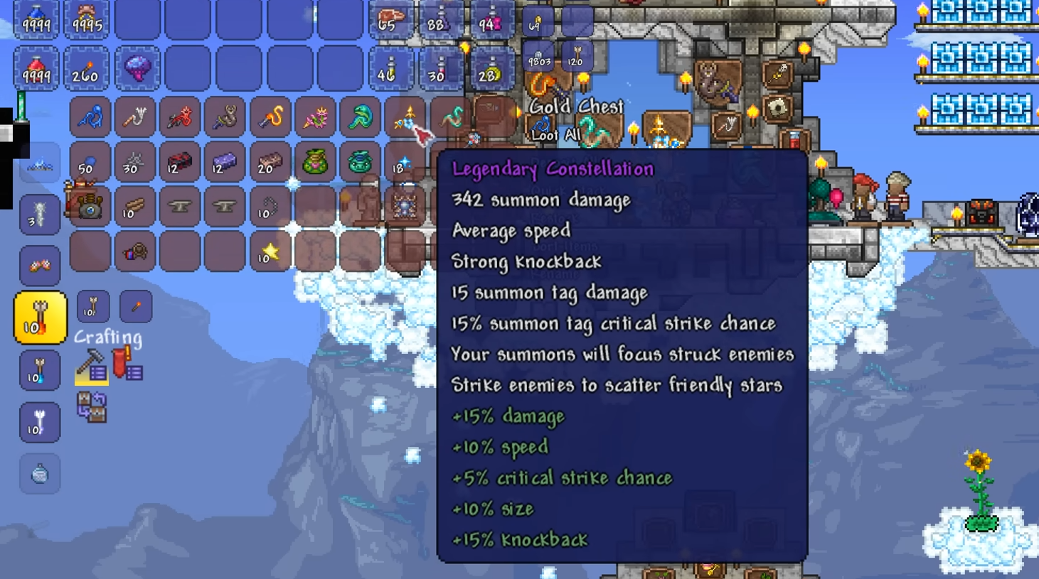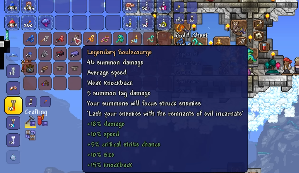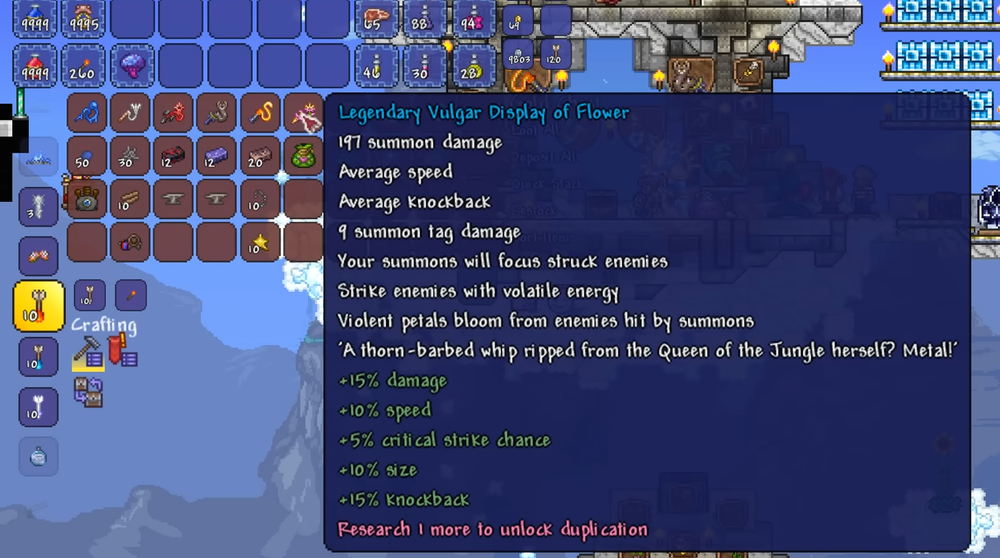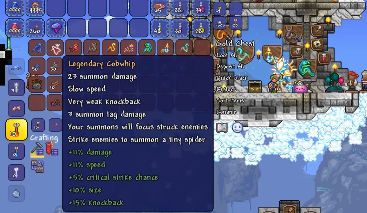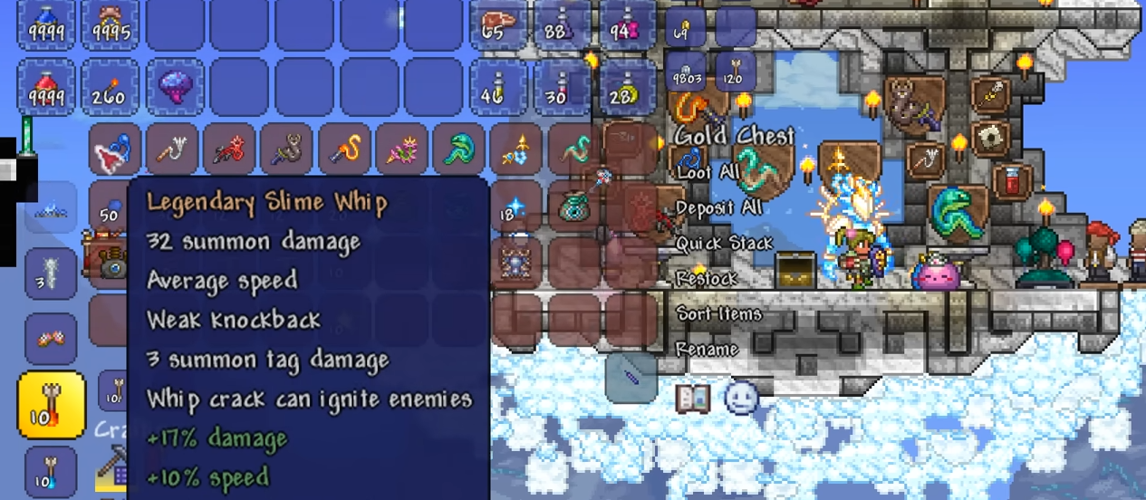 | Full 1.4.5 whip lineup | All 9 whips for summoner progression and loadout flexibility | Crafting + boss drops |