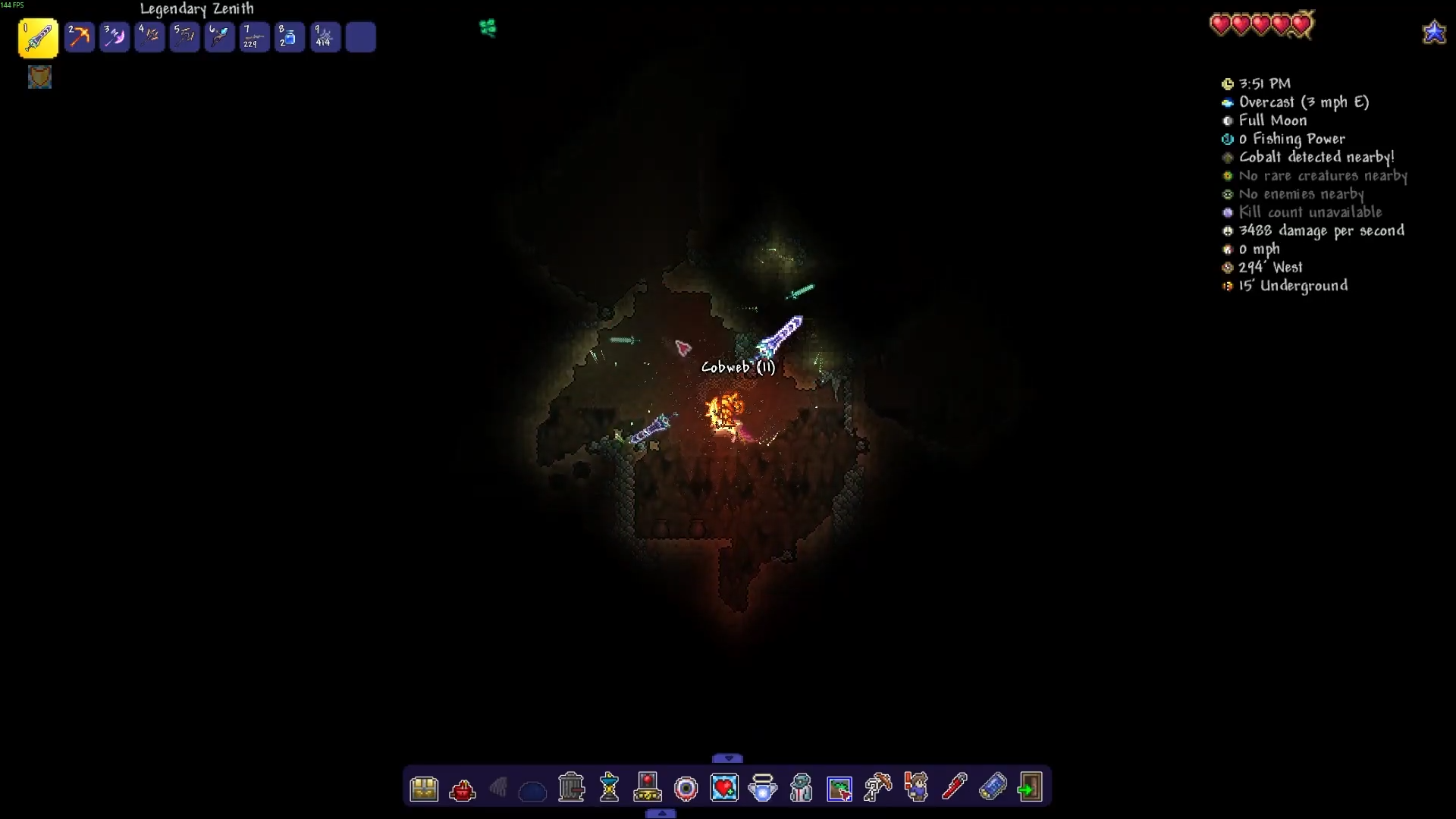 You will spend most of your time near the surface chopping trees for Wood, then underground in caves and webs for Cobweb to turn into Silk at your Loom.