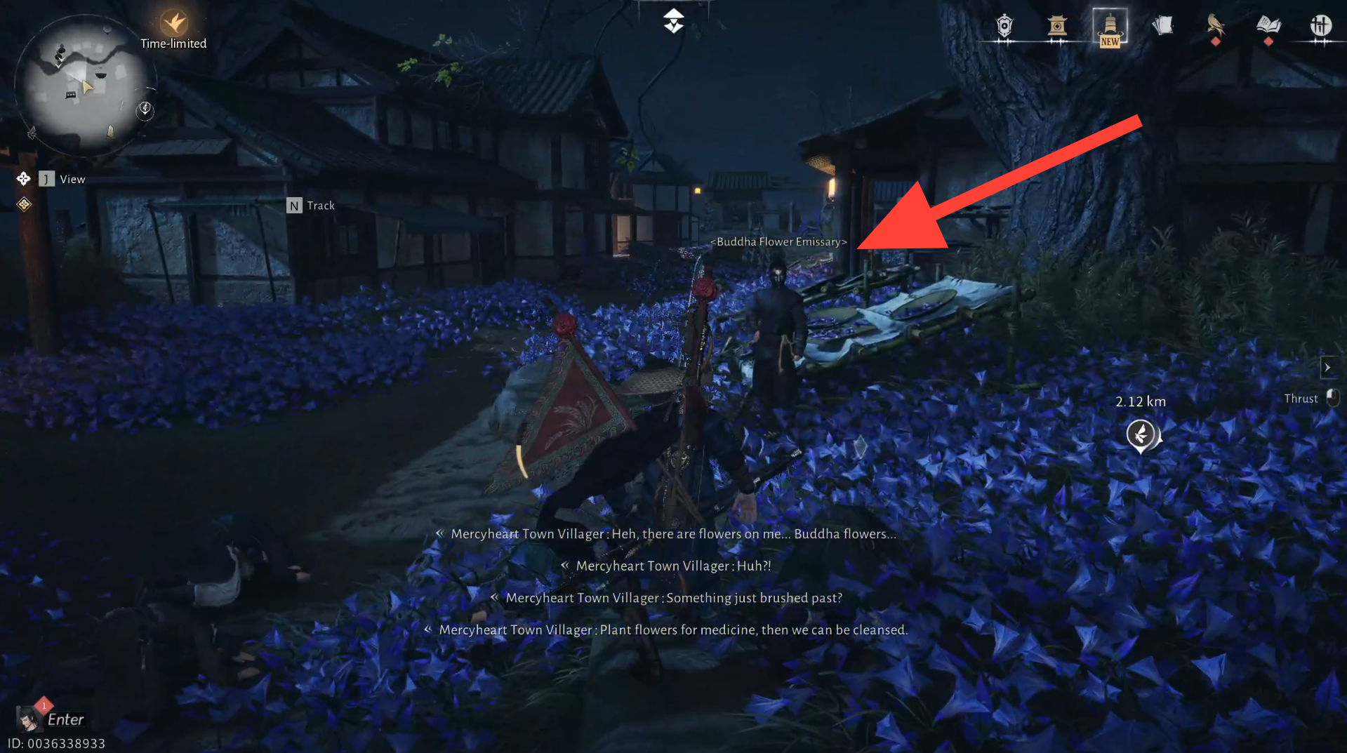 Go to the marked location below during the “Xu” hour and locate the Buddha Flower Emissary, who is surrounded by two people kneeling before him.