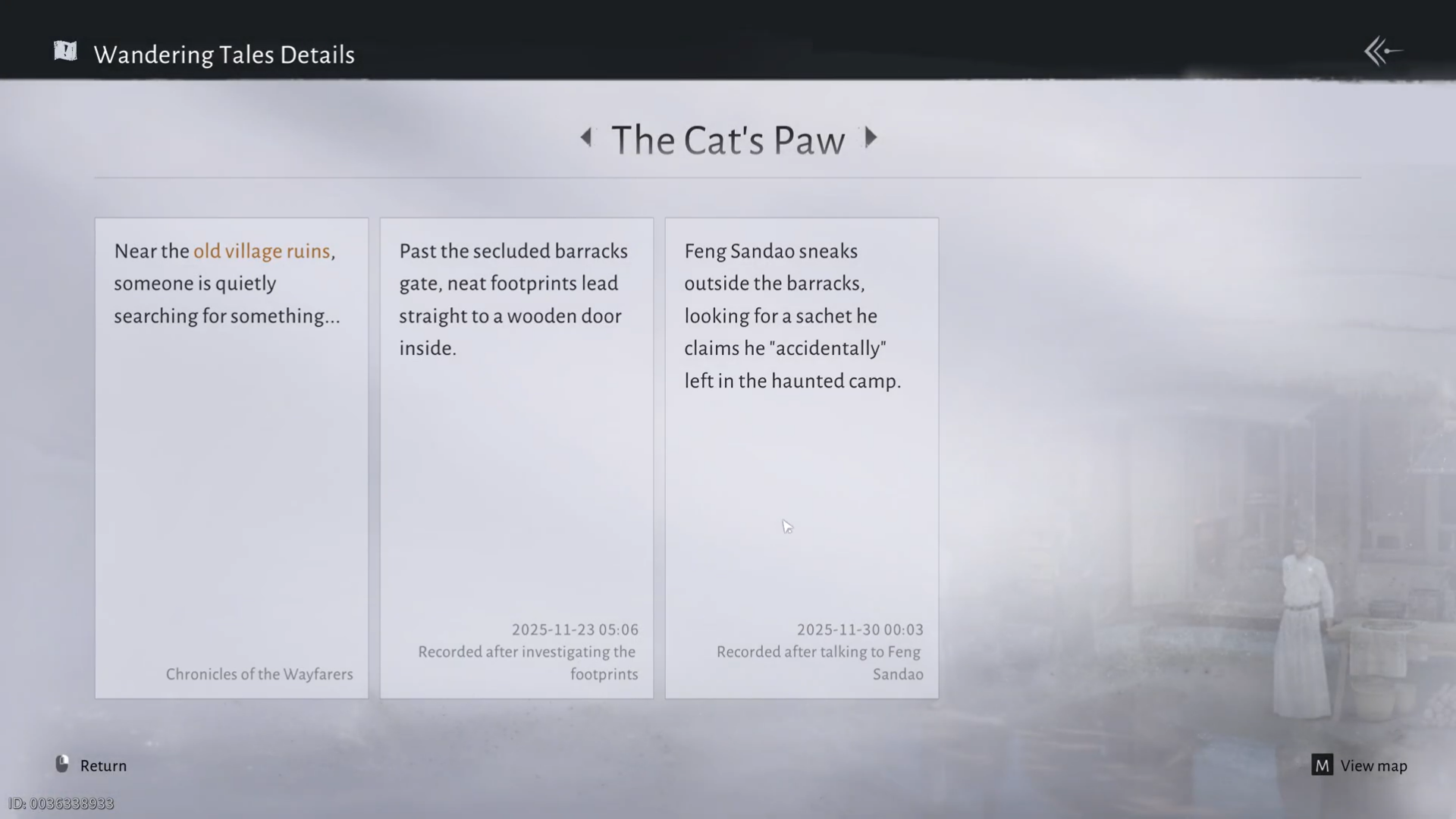 The Cat’s Paw is a brief but atmospheric Wandering Tale that mixes exploration with light stealth. Recover the sachet, uncover Feng Sandao’s secret meeting, and enjoy the useful early-game rewards it offers.