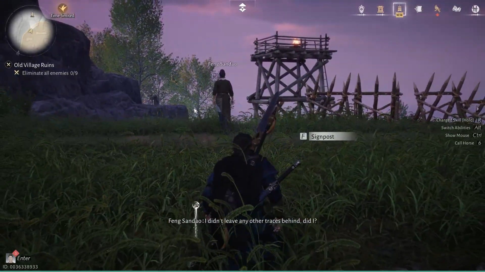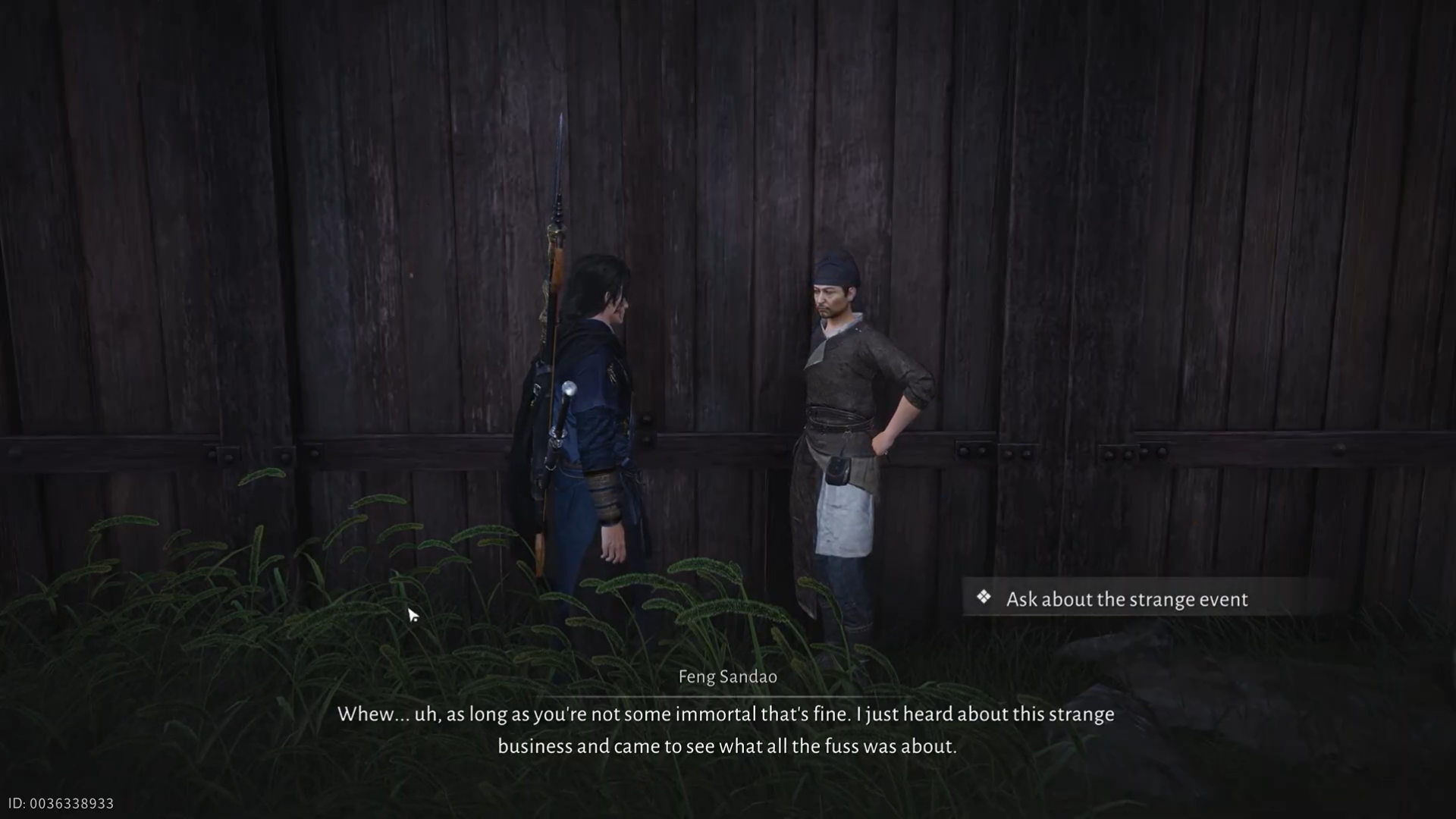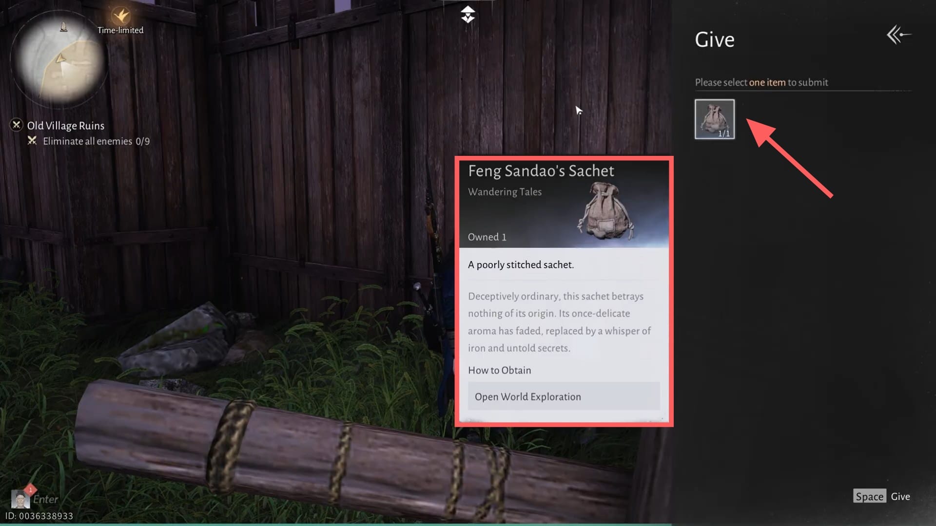 Head into the Old Village Ruins, where you’ll spot Feng Sandao lingering by the old wooden walls, clearly distressed and looking for something.