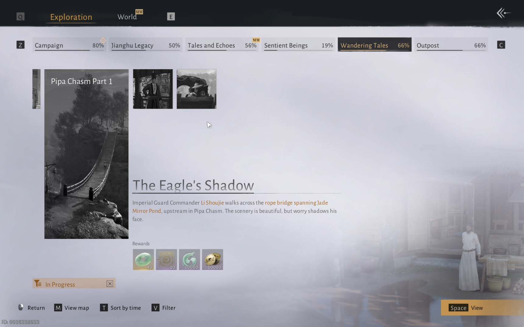 The "Eagle's Shadow" is a Wandering Tale in Where Winds Meet that begins on a bridge with Li Shoujie. Collect 3 parts of a Wooden Eagle and then return them to Li Shoujie to trigger a cutscene to conclude the tale.