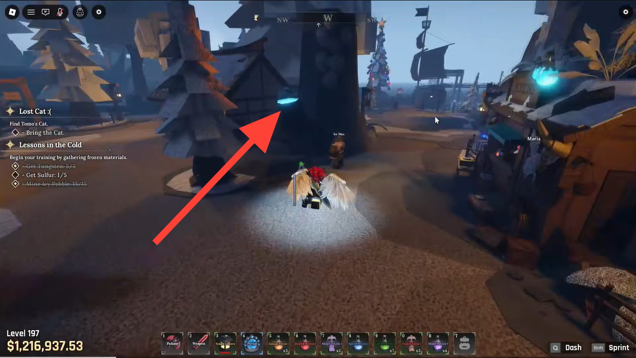 The pickaxe is located in a frozen lake on Island 3, near the NPC Bjorn. Here’s how to get there: