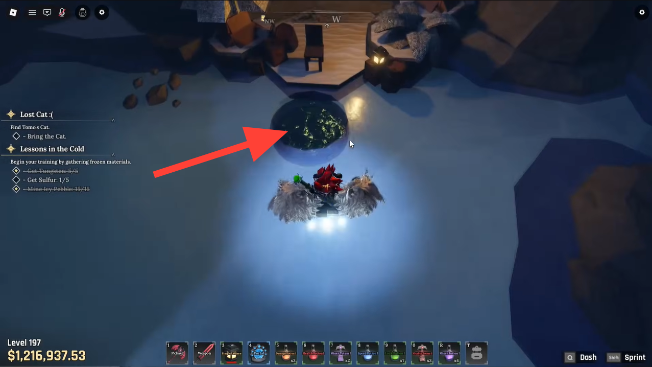 Jump into the hole and swim all the way down to the very bottom of the lake. At the bottom, you’ll see a massive Mosasaurus frozen inside thick, translucent ice, and deep inside that ice block is the Prismatic Pickaxe itself.