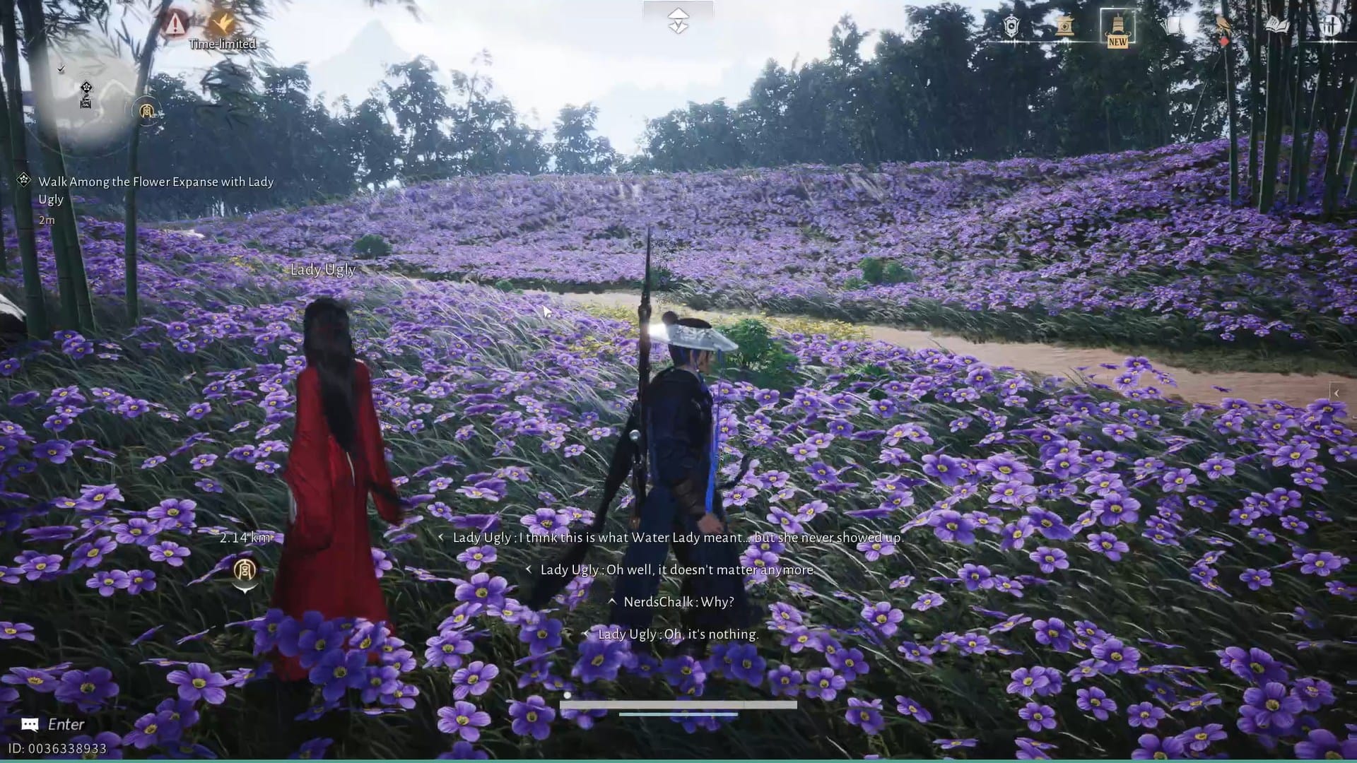 Talk to Lady Ugly again and follow her towards the Flower Expanse while engaging her story.