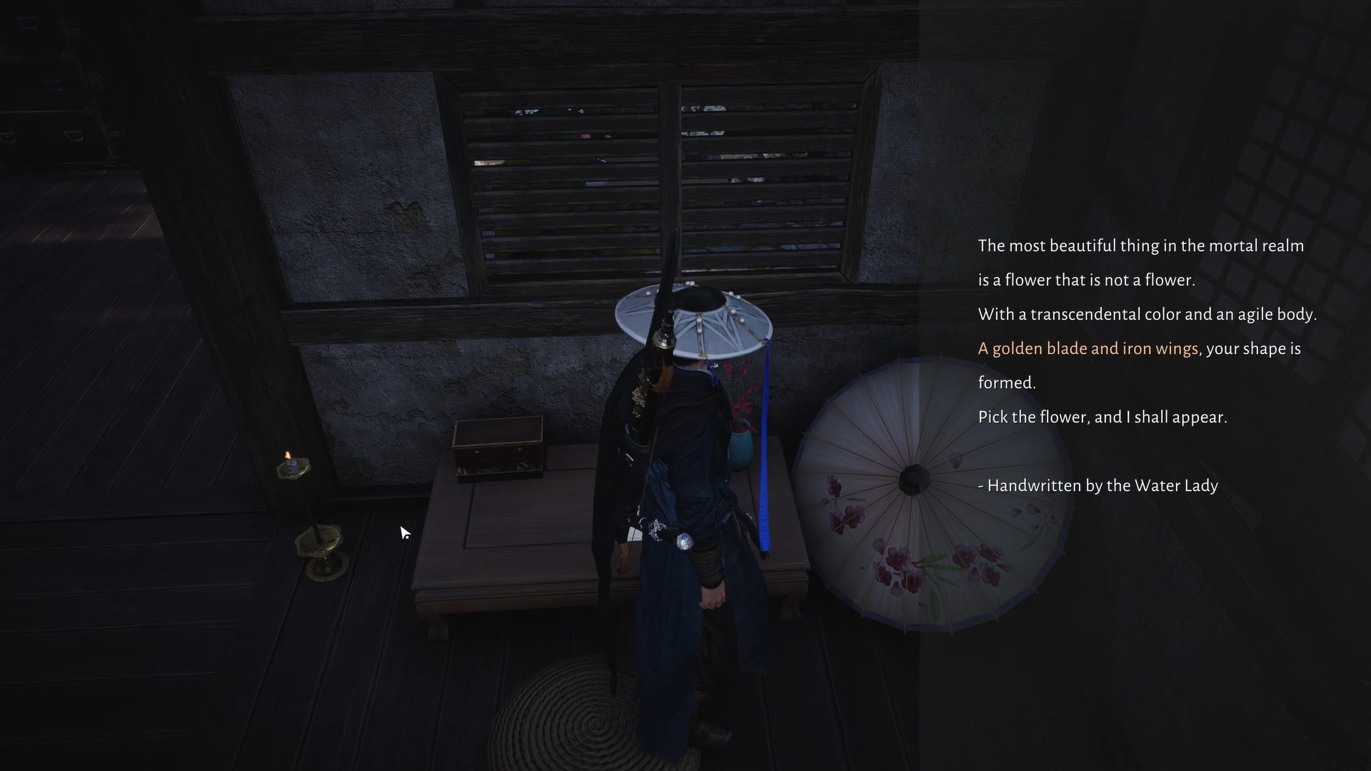Go back to Lady Ugly's hut and find the Letter from and you will get to know something about a flower with 'a golden blade and iron wings.'