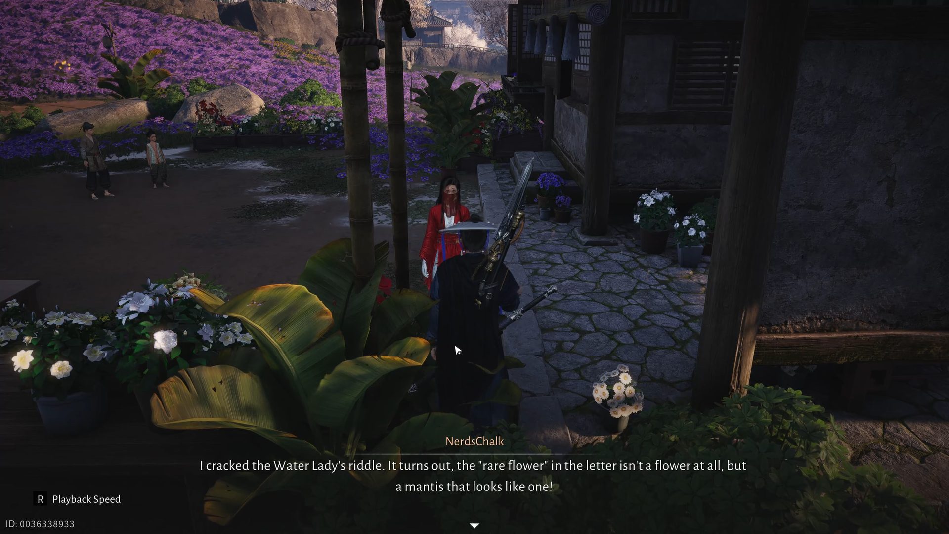 Kids find their way back to the hut, but this time, ask them about the flower and they reveal that they know the location of the Golden-armed Mantis.