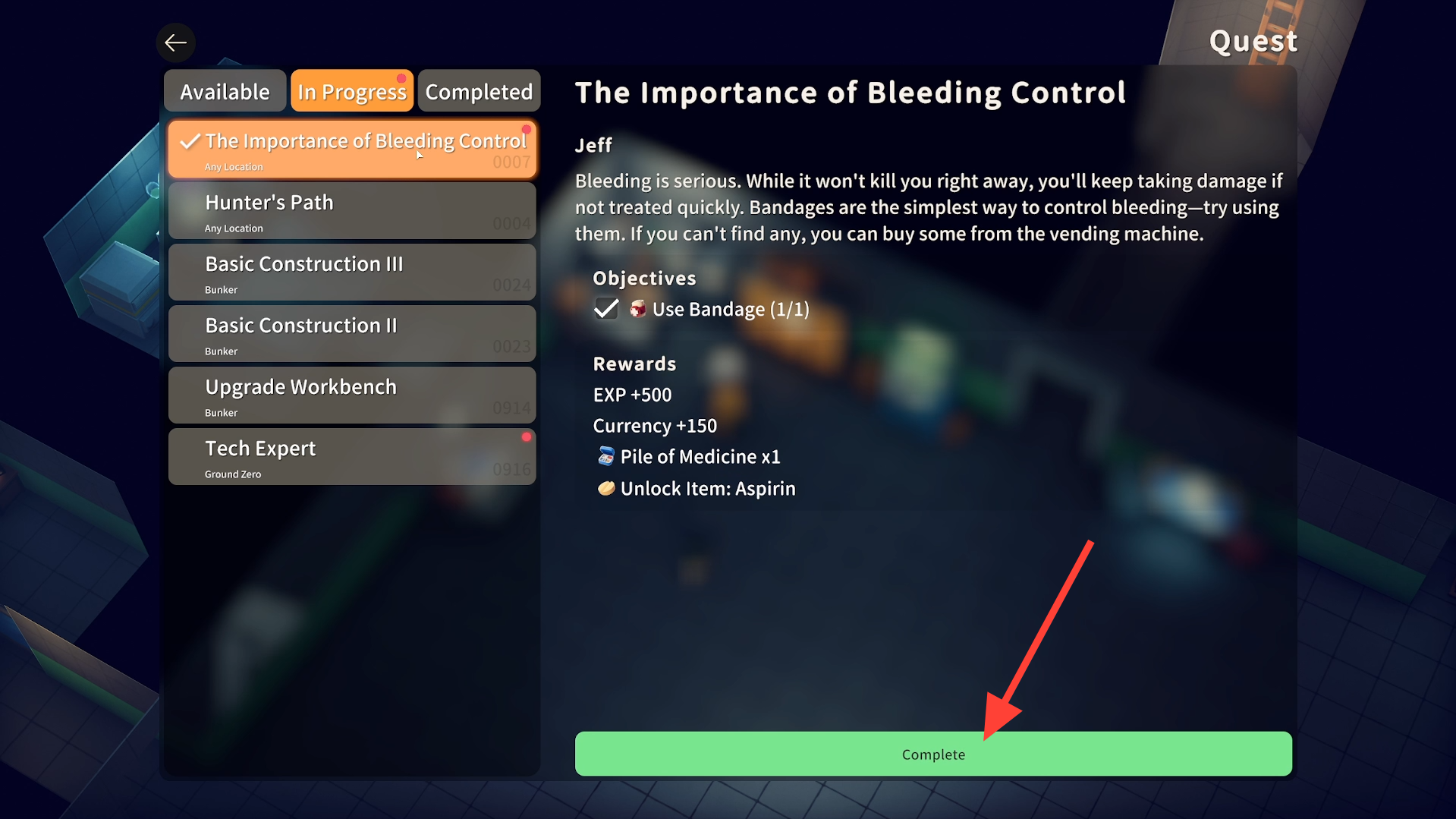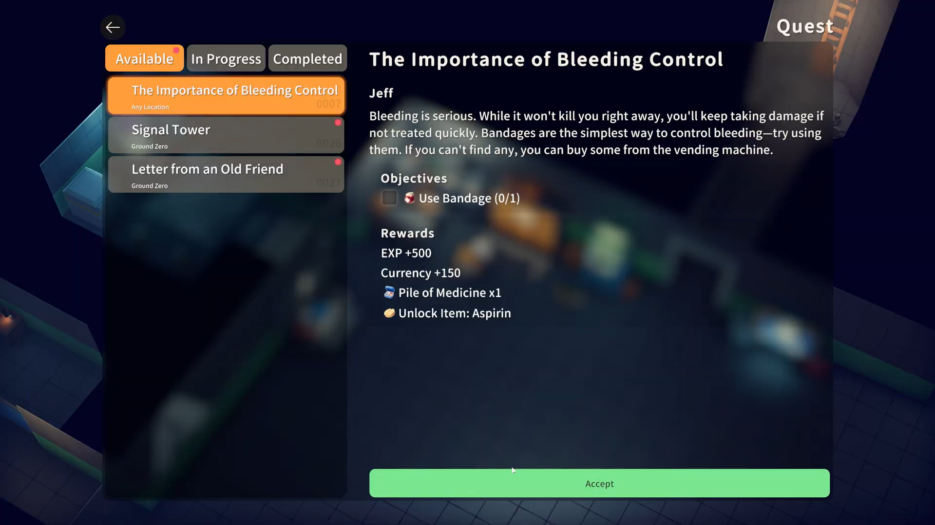 - "The Importance of Bleeding Control" is an early quest on Ground Zero that requires using a bandage to stop bleeding.