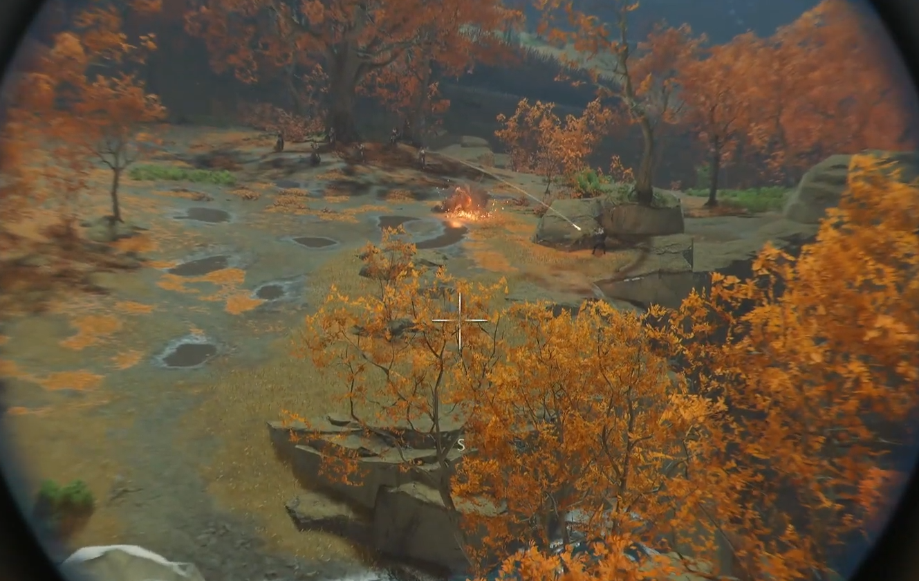 From the cliff ledge, equip the spyglass and aim at the fight in the valley — you should see a scout under attack by Oni Raiders behind rocks.