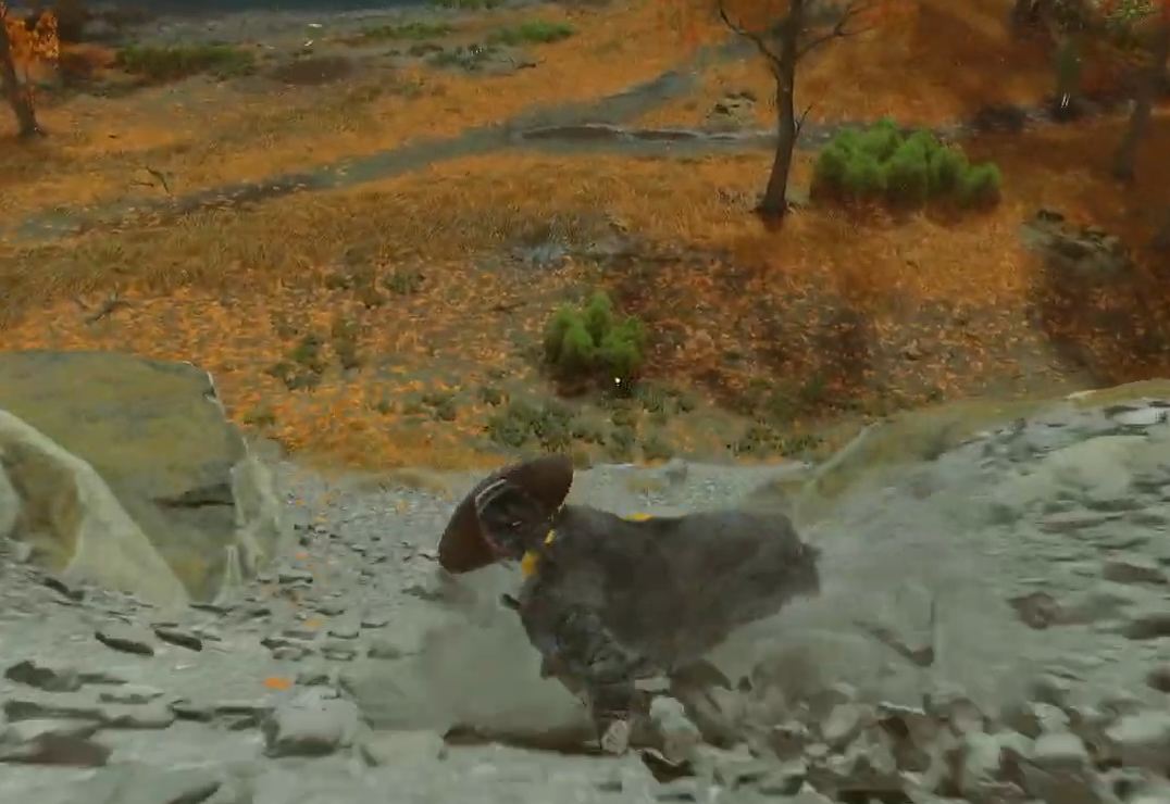 Drop/slide down the slope or climb down to the valley floor where the Oni Raiders are attacking the scout. Watch your footing—there’s a short climb/slide to reach them.