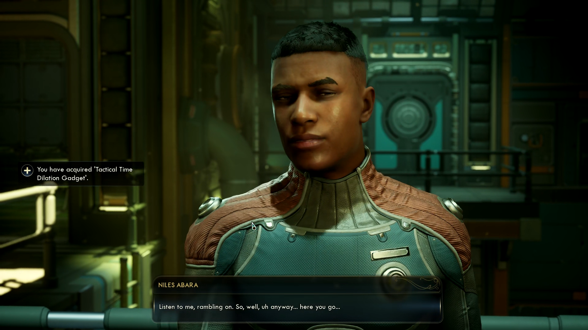 Speak with Niles Abara to obtain the Tactical Time Dilation Gadget, helpful for combat and stealth.