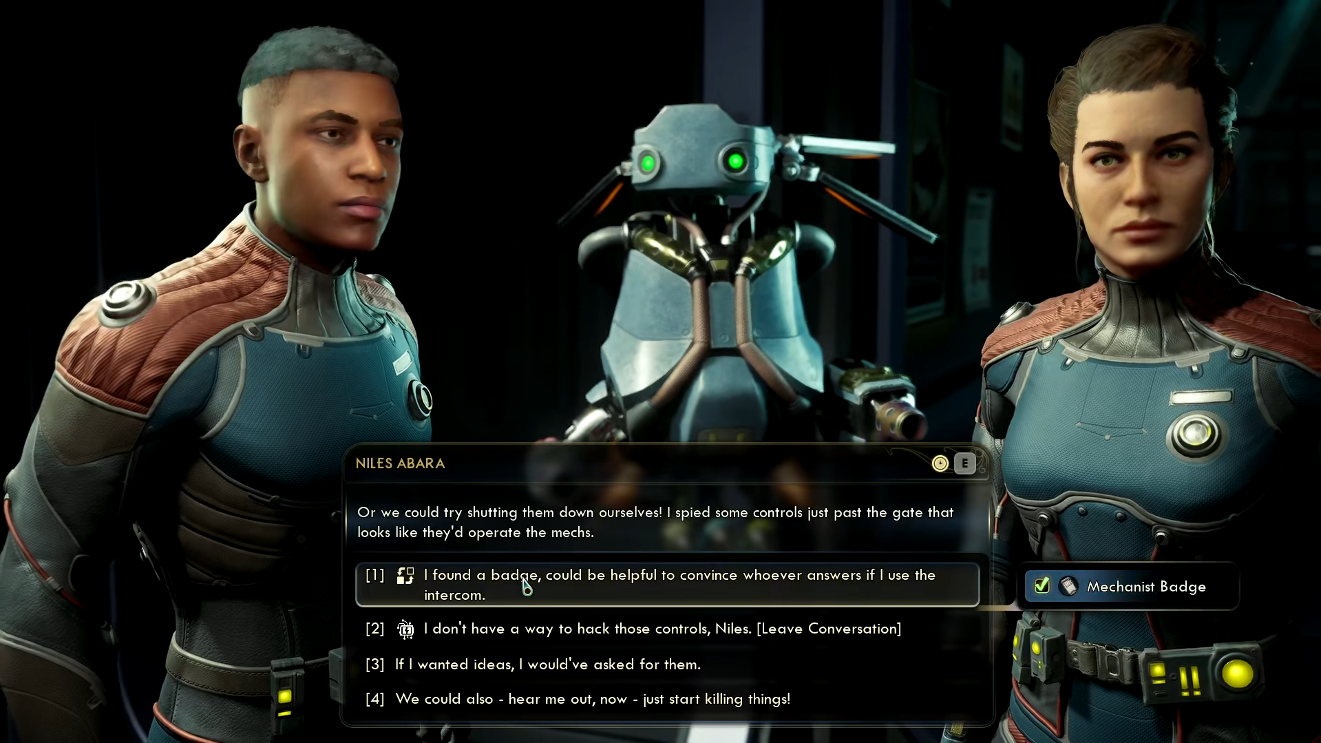 Head downstairs to the intercom to handle the security bots. Out of the three options, choose the fourth option to go guns blazing.