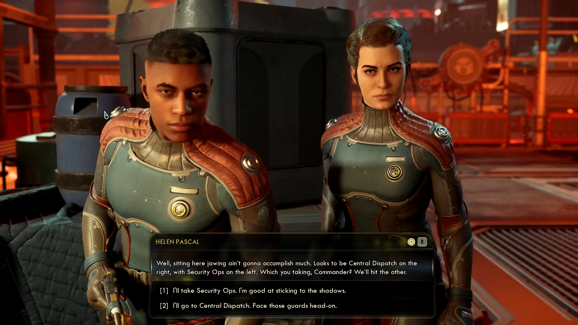 After fighting through the security bots, choose between two paths: Security Ops focuses on stealth and obtaining items like the Pumping Station Keycard using skills such as Lockpick, Hack, and Engineering. Central Dispatch emphasizes combat, leading to unique interactions later.