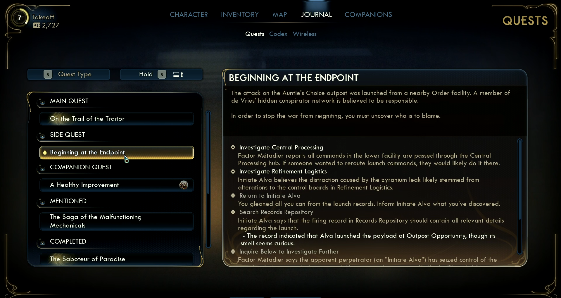 The Beginning at the Endpoint quest is triggered during the main storyline quest called On the Trail of the Traitor. As you progress through this central quest, you receive a Writ of Investigative Inquiry that allows you to enter the Zyranium Manufactory VII in Golden Ridge. Presenting this writ at the factory gate begins Beginning at the Endpoint, sending you on a deeper investigation into a sabotage that is linked to the main plot.
