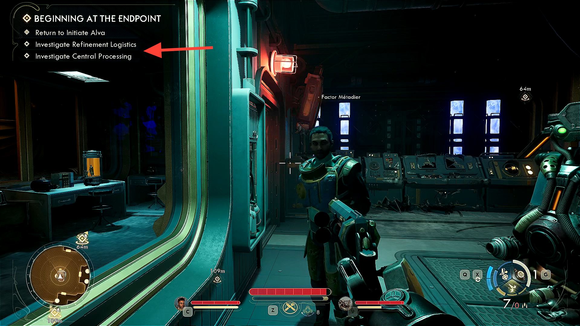 Return to Initiate Alva and speak with her — she’ll direct you to investigate Refinement Logistics and Central Processing next.