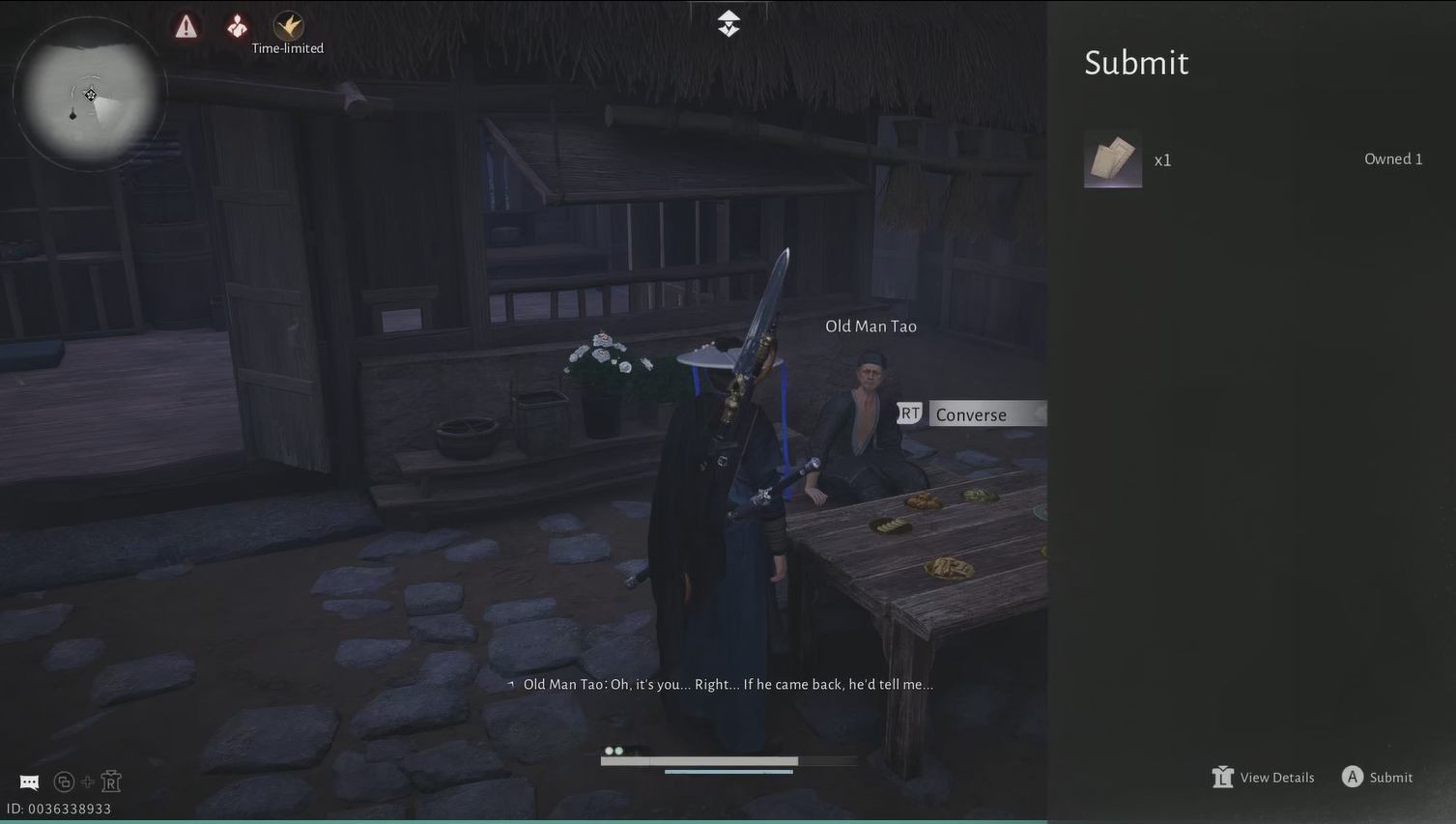 Set the in-game time to the next day at Mao hour and return to the old man.
