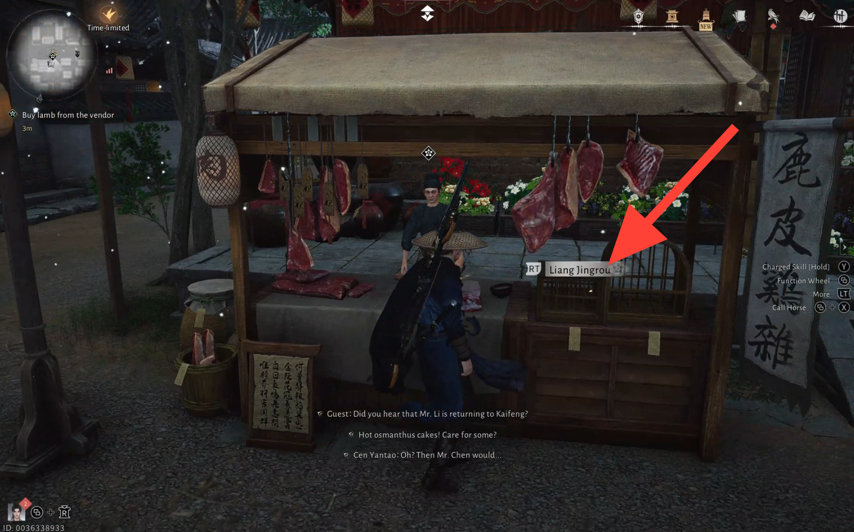 Go to Fan Manor in Kaifeng and speak with the vendor Liang Jingrou to purchase some lamb.