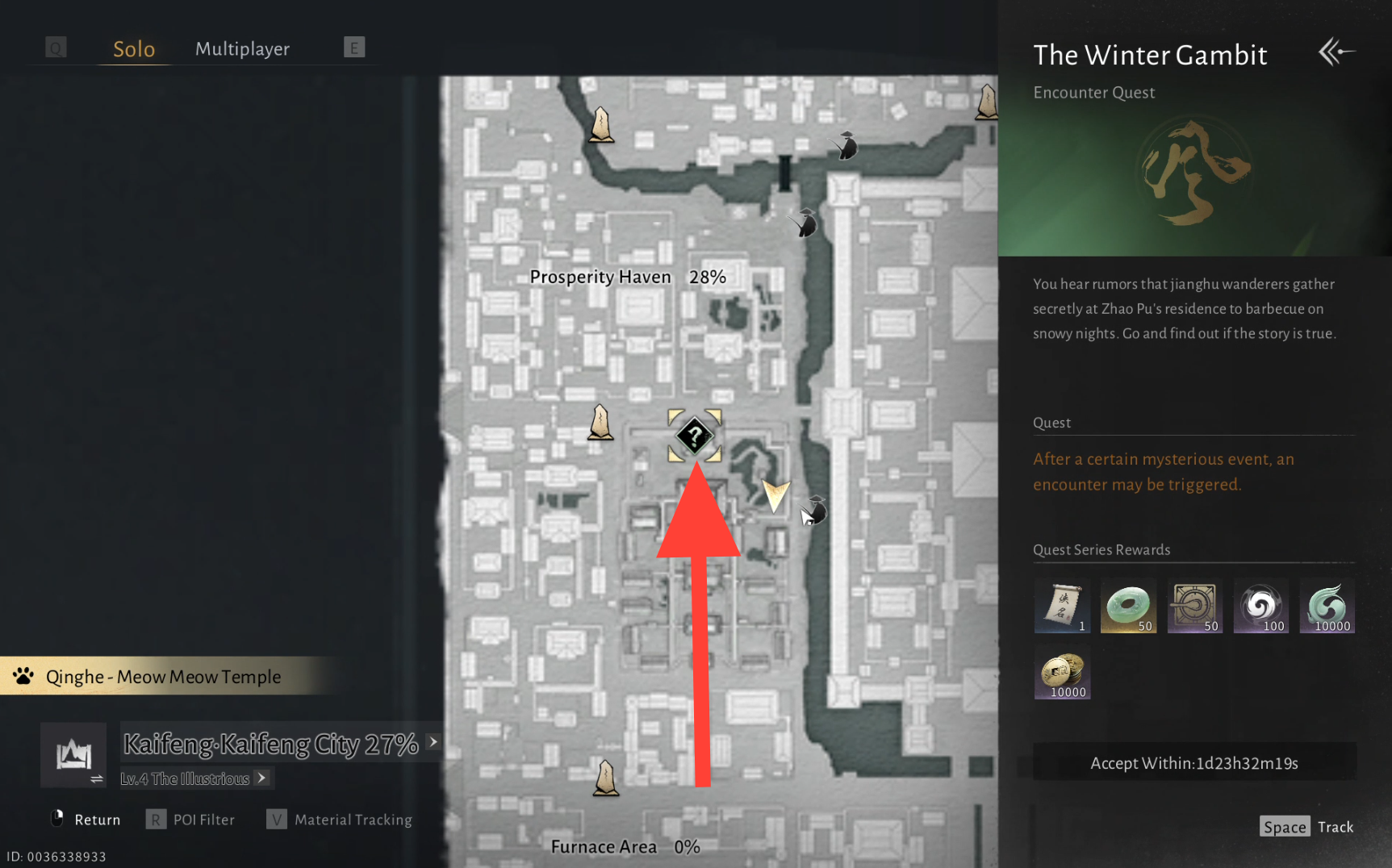 To start this quest, go to the marked location in Prosperity Haven, Kaifeng City, and examine the scroll on the table in the top room of the building.
