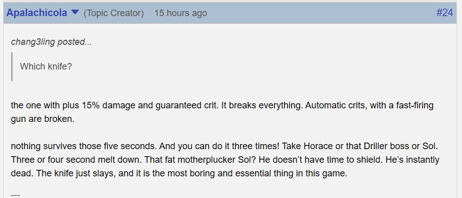 - Use the knife directly on a tough enemy or boss to apply the Penetrator effect. Then switch to your high-damage or status effect weapons to exploit the guaranteed crits.