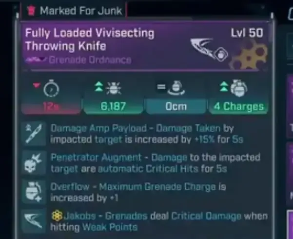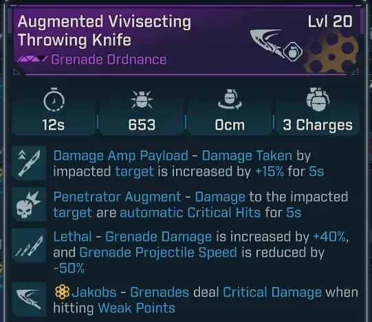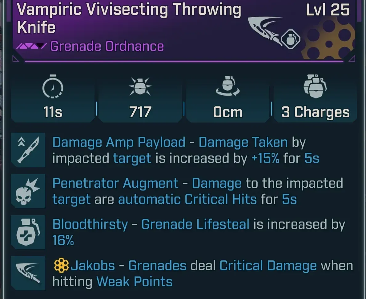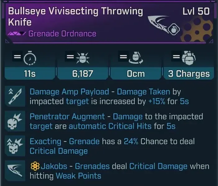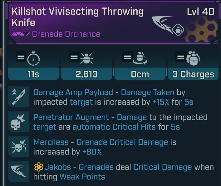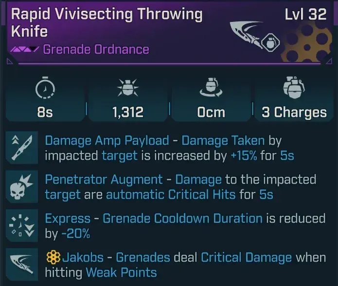 Throwing knives aren't your typical explosives; you hurl them directly at foes using the same controls as grenades. Upon impact, they deliver immediate damage and apply augments like Penetrator, which forces all subsequent hits on the target to crit. This mechanic shines in fast-paced fights, where you can tag a boss and watch your weapons shred through health bars.