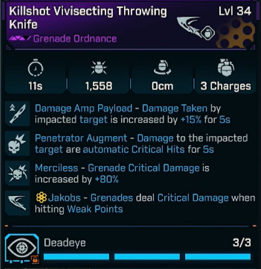 - Killshot Vivisecting Throwing Knife occupies the Ordnance slot and function like grenades, requiring direct hits on enemies to activate effects.