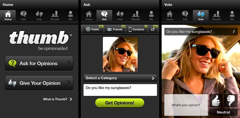 Thumb is a really intuitive app that lets you input a question, select a category (e.g relationships, politics, fashion, etc.), and submit it for other Thumb users to answer. It’s quite simple, and opinions start pouring in after just a few seconds. People can vote for your question with a ‘Thumbs Up’ or ‘Thumbs Down’, along with their opinion on whatever you ask, or give it a Neutral rating. You have the option to reply to people’s comments as well. Thumb will also give you a percentage of positive and negative user responses. And of course, you can vote on other people’s questions as well.