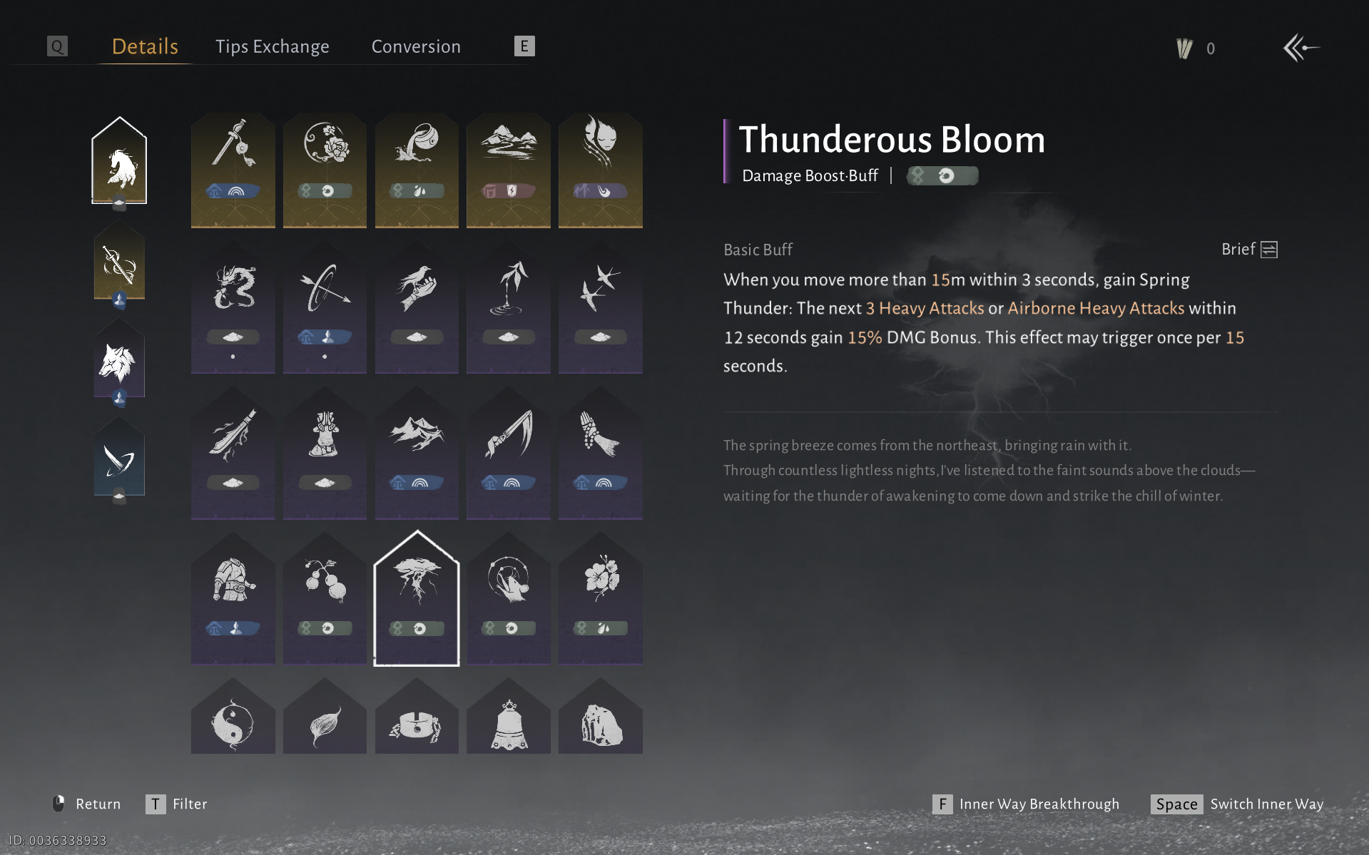 - After moving more than 15m within 3 seconds, gain Spring Thunder: The next 3 Heavy Attacks or Airborne Heavy Attacks within 12 seconds gain 15% DMG Bonus.