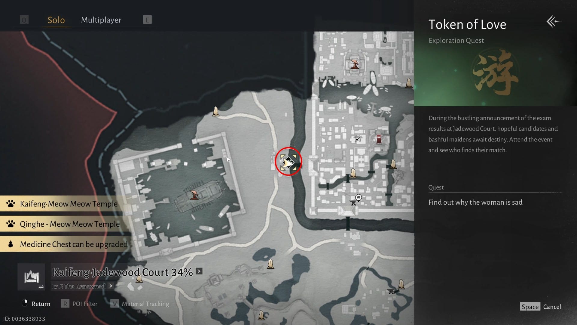The exploration quest 'Token of Love' takes place in Jadewood Court in Kaifeng. The exact location is given below.