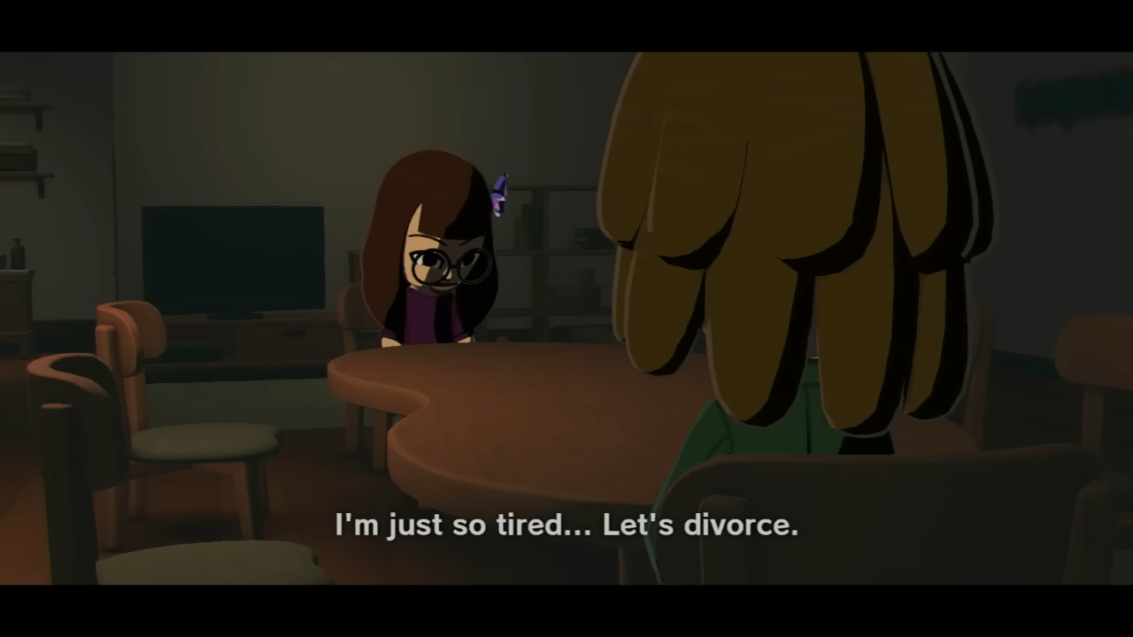 | Failed reconciliation | Divorce occurs | Emotional shift in Miis |