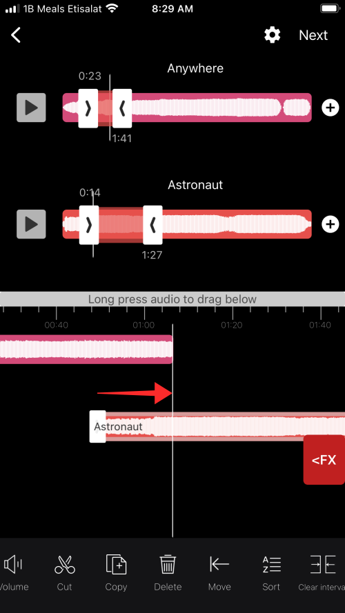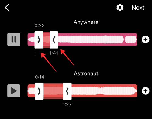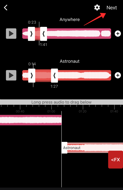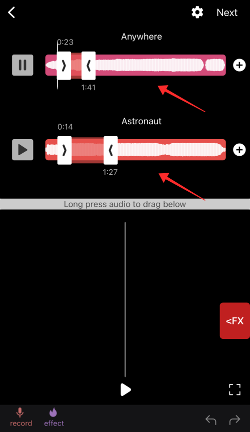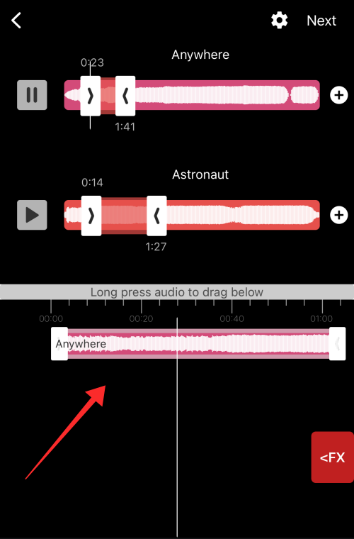 You will land on the audio editor page which has a simple UI with independent soundwave seek bars for each audio file you imported to trim the sounds .
