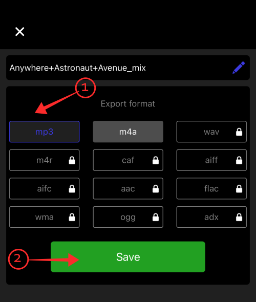 Once you have adjusted each component audio clip to your satisfaction, tap Format to select a media type into which you want the new file to be created. TikTok audio files are mandated to be mp3 in format, so, the default setting (which is mp3) need not be adjusted.